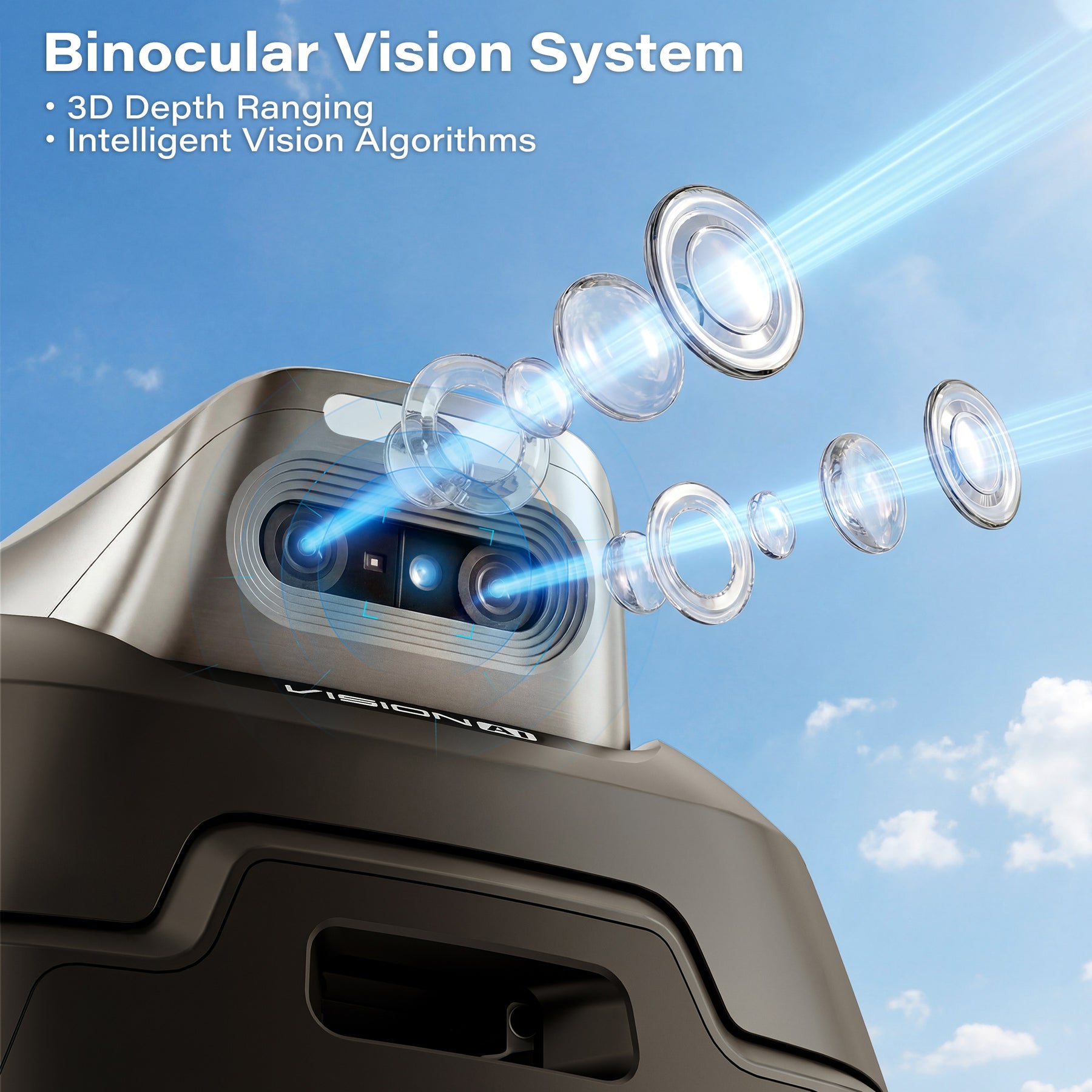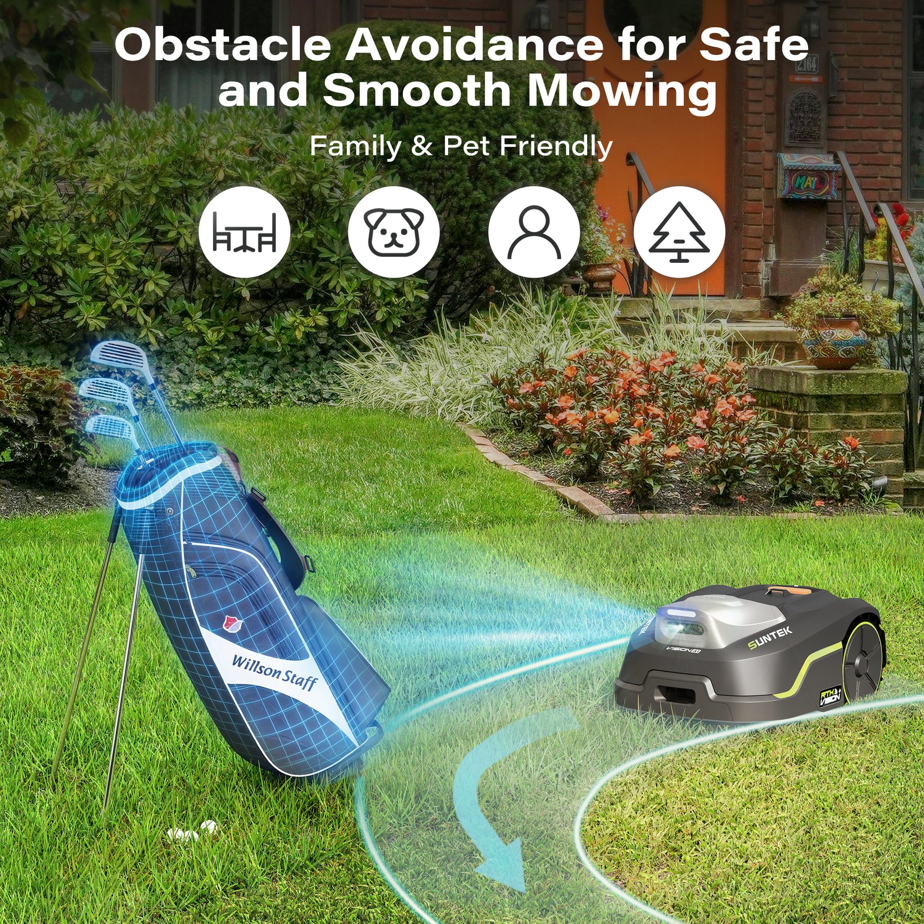 【Automatic Obstacle Avoidance】The boundary wire-free robot mower utilizes an AI camera to recognize obstacles such as stones or tree stumps in real time and automatically navigate around them. The enhanced stereo vision system enables more precise 3D spatial perception and autonomous navigation, providing multi-layered protection for your family and pets.