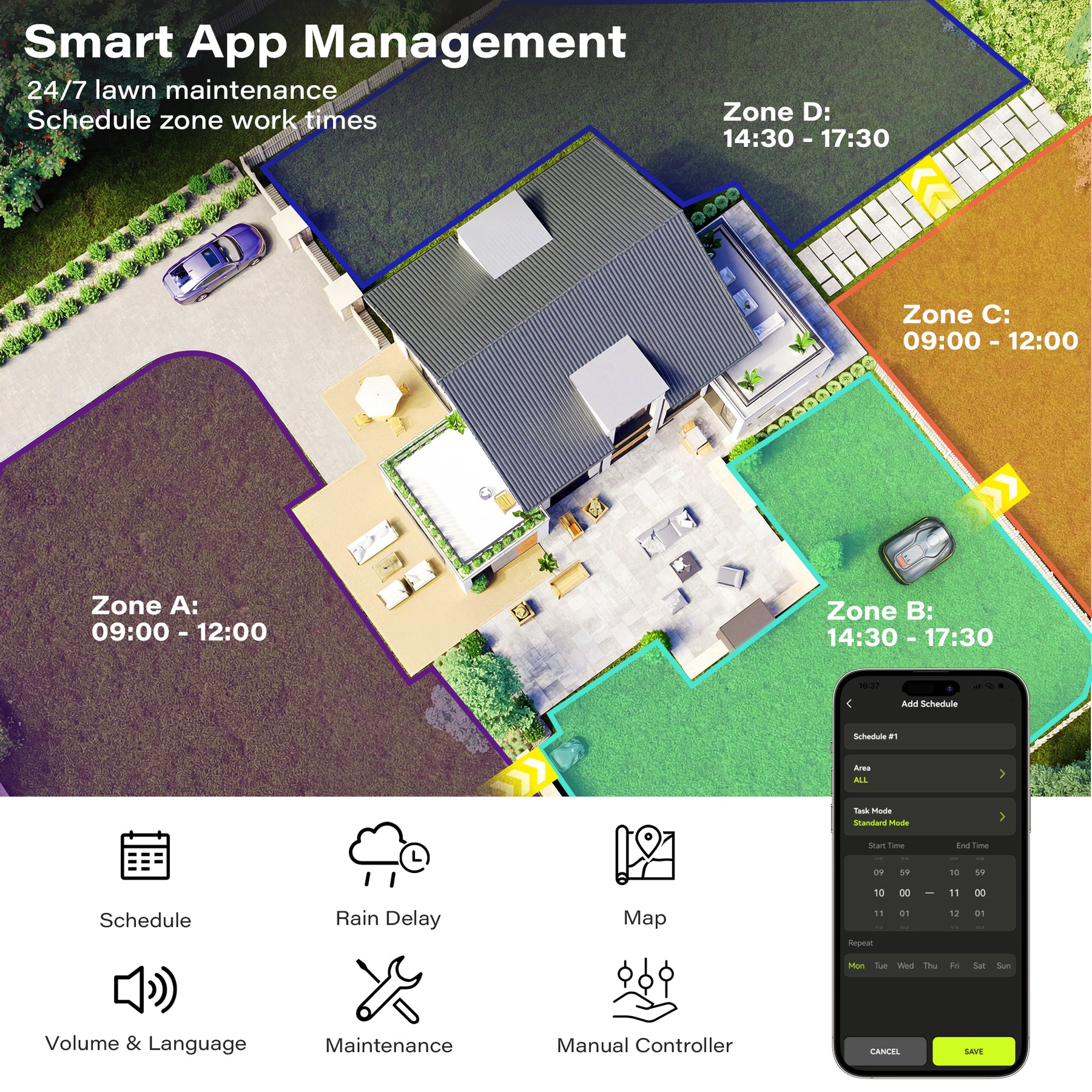 【Multi-Zone Management via App】With the SUNTEK App, you can set up to 5 independent mowing zones, no-go areas, and connecting paths for your robotic lawn mower. Each zone can be customized individually—you can freely adjust the mowing angle and cutting height (1.2–2.4 inch) according to your needs.